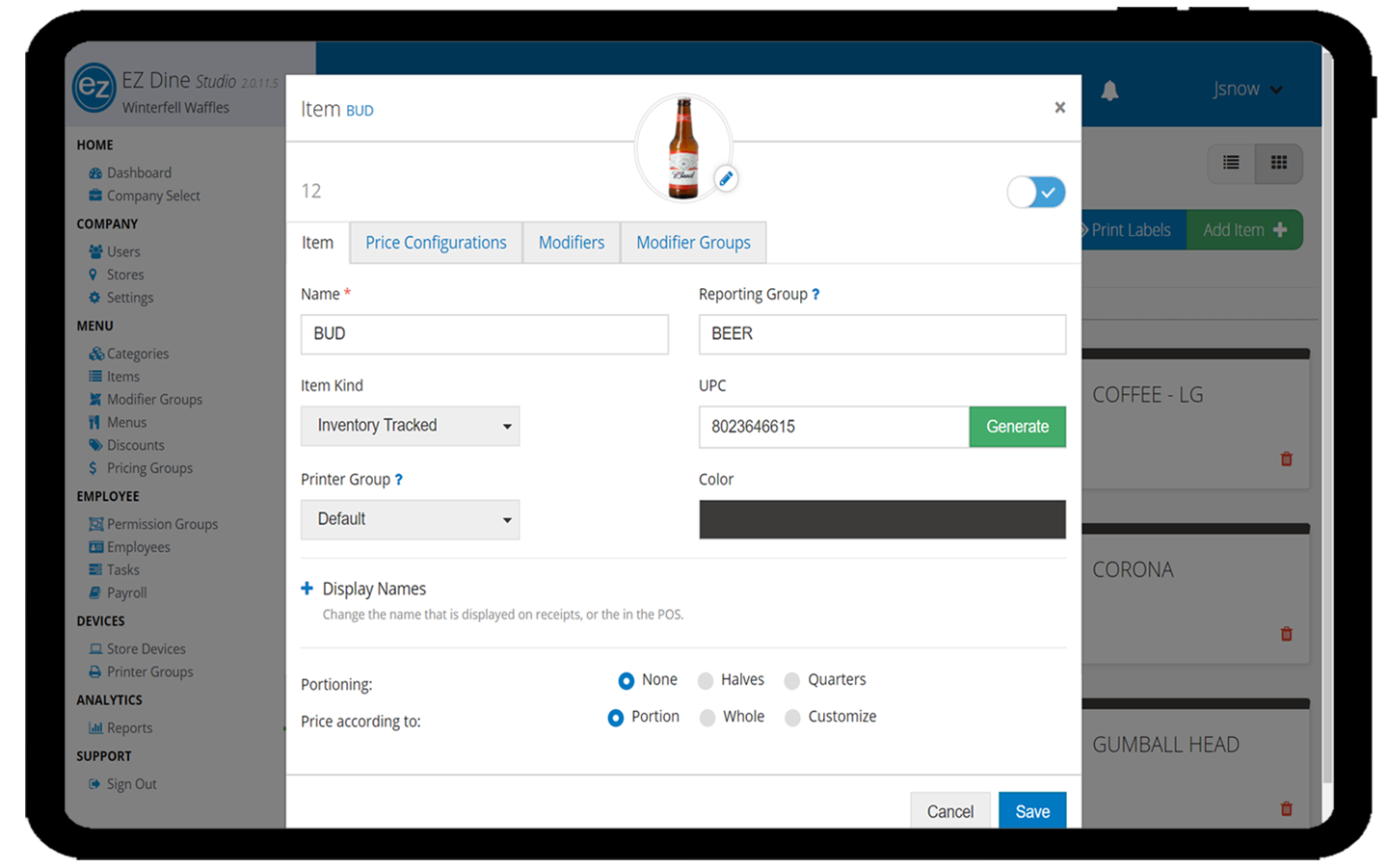 EZ Dine Studio Item update screen. Update the name, reporting group, UPC, printers group, inventory, price configurations, and modifiers.