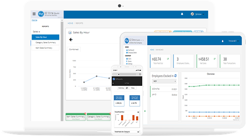 Quickly view business analytics with the reports Dashboard and Sales by Hour reports.